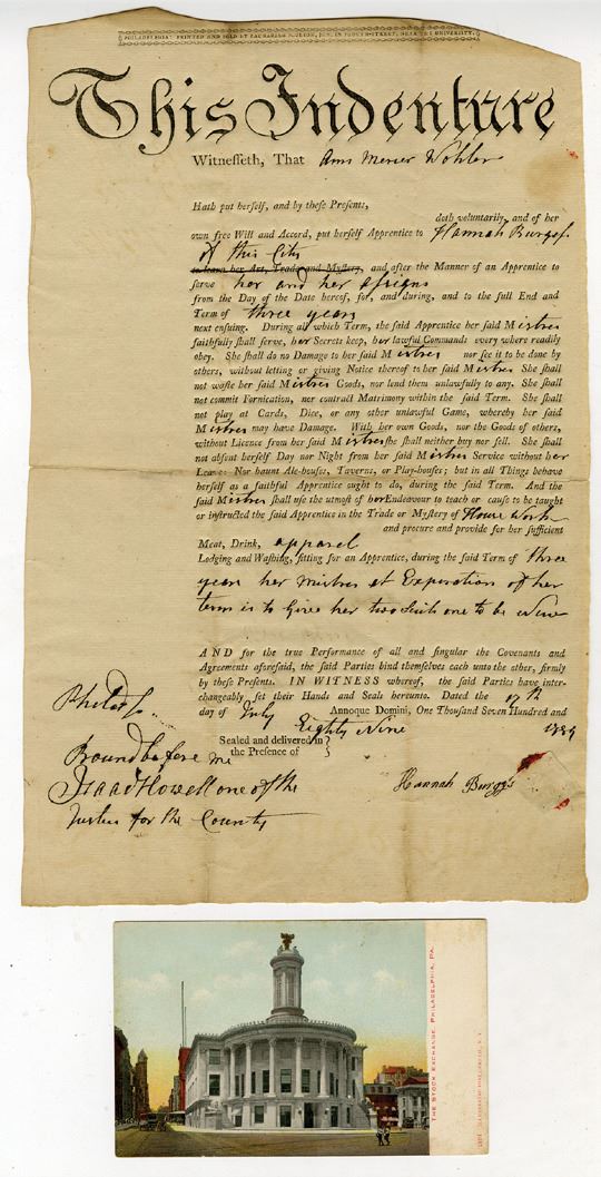 Philadelphia, Pennsylvania, 1789. Issued Indenture certifying that Ann M. Wohler "voluntarily, and of her own free Will and Accord, put herself Apprentice to Hannah Burgess," for a term of three years. The document then describes and outlines the relationship between Apprentice and Mistress, asserting that the Apprentice "faithfully shall serve" her Mistress, "her Secrets keep, her lawful Commands every where readily obey." The Apprentice will "not commit Fornication, nor contract Matrimony within the said Term. She shall not play at Cards, Dice, or any other unlawful Game," among other stipulations. In turn, the Mistress "shall use the utmost of her Endeavour to teach" the Apprentice in the trade of "House Work." Black text, names of Apprentice and Mistress may differ slightly due to handwriting legibility, also in black. Signed by the Mistress, Hannah Burgess at bottom right near seal, Signed by Isaac Howell as "one of the Justices for the County" at bottom left. Isaac Howell (1722-1797) was a member of the Committee of Correspondence, and on July 15th, 1774 was a Deputy for the City and County of Philadelphia at the Provincial Meeting of Deputies. He was also authorized by the Continental Congress to sign and number bills of credit to the amount of $4 million. He served the public of Philadelphia as Justice of the Court of Common Pleas, Quarter Sessions, and the Orphan's Court, and also served as Street Commissioner. Fine-VF condition with toning and archival repairs on back at center. Printed by Zachariah Paulson. Rare and unique piece of early American history.