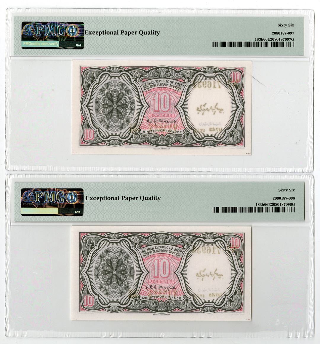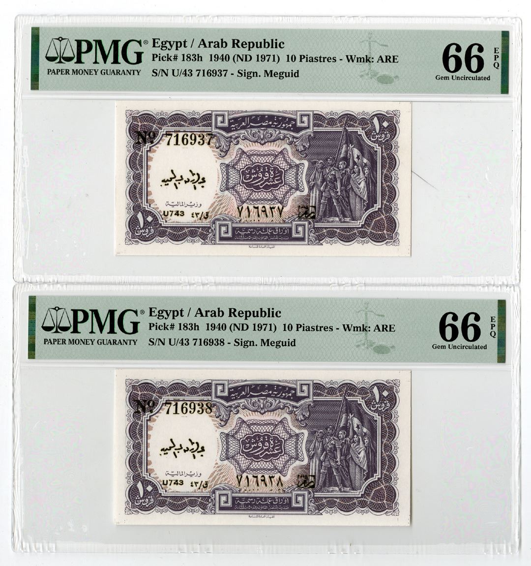 Egypt/Arab Republic. 1940 (ND 1971). 2 Issued banknotes, both are: 10 Piastres, P-183h, Purple, Sequential S/Ns are U/43 716937 and U/43 716938, Sign. Meguid, Watermark: ARE, and are PMG graded Gem Uncirculated 66 EPQ. (2) Tied for highest graded out of 27 graded in the PMG census.