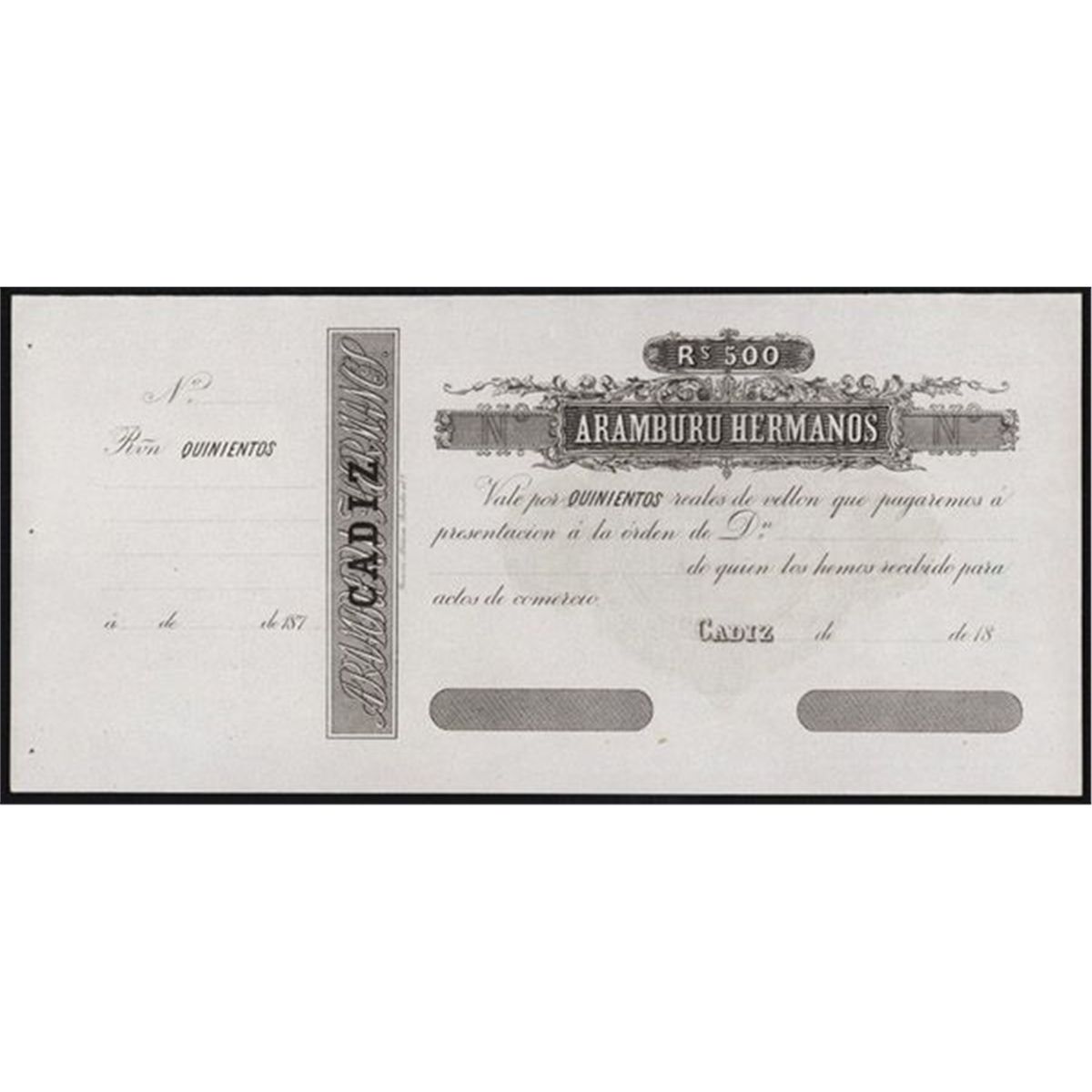 Cadiz, Spain, 18xx (ca. 1870's), 500 Reales De Vellon, Remainder, Black on face with ornate title, back green with cameo Mercury heads flanking denomination in middle, counterfoil on left, AU to uncirculated condition. Scarce note that is only found unissued. BWC.