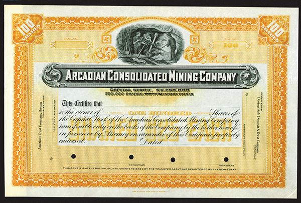 Michigan, ND (ca.1900-1920), <100 Shares, Specimen, Black with blue border and underprint, Miners working over title in middle, Capital stock $6,250,000. POC's, Uncirculated condition. Rare Michigan mining stock certificate and possibly unique as specimen. JAL BNC. ",150,250,500