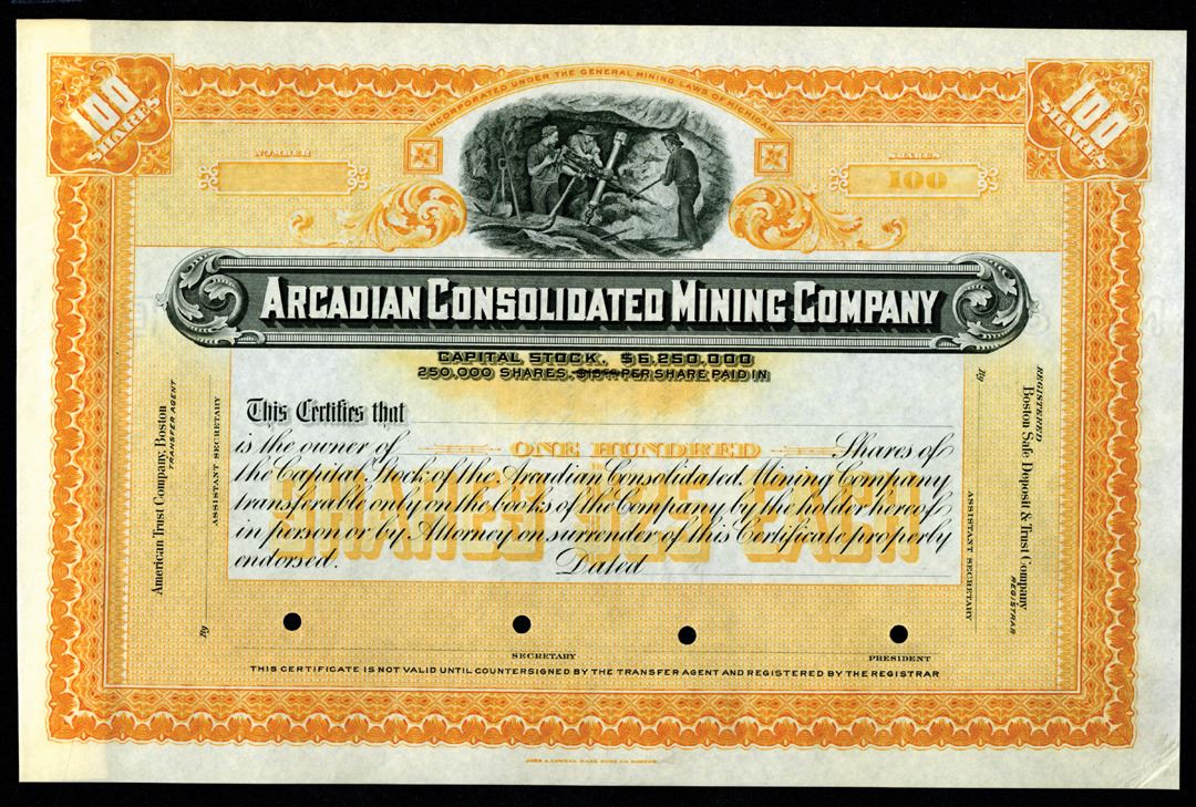 Michigan, ND (ca.1900-1920), 100 Shares, Specimen, Black with orange-yellow border and underprint, Miners working over title in middle, Capital stock $6,250,000. POC's, Uncirculated condition. Rare Michigan mining stock certificate and possibly unique as specimen. John A. Lowell BNC.