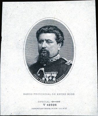 1860-1890's. 9 different proof vignettes, 8 printed on india only and one printed on india on card. Includes vignettes from: Banco Provincial De Entre Rios, P-S767, Genl Don Edwardo Racedo; Republica Argentina, P-7, Genl.Mitre; and other vignettes possibly used on additional banknotes, checks and drafts. All in choice condition. Rare group of impressive men. NBNC, ABNC.