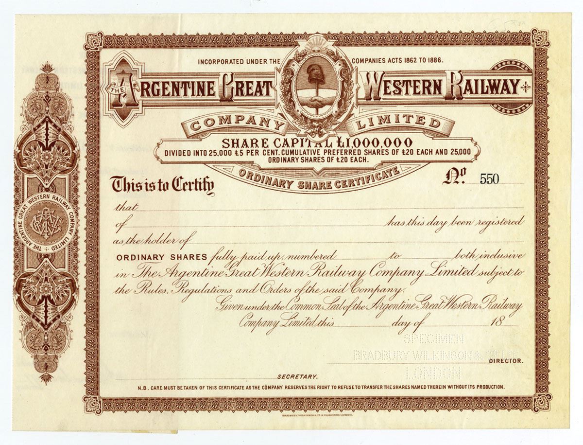Argentina. Odd Shares Specimen Stock Certificate. Brown print with a brown geometric border. Arms of Argentina with joined hands and cap on stick at top center of certificate. Pin punch SPECIMEN overprint and POC. XF Condition. Bradbury Wilkinson & Co. Ld., Engravers, London. Rare Argentine railroad.