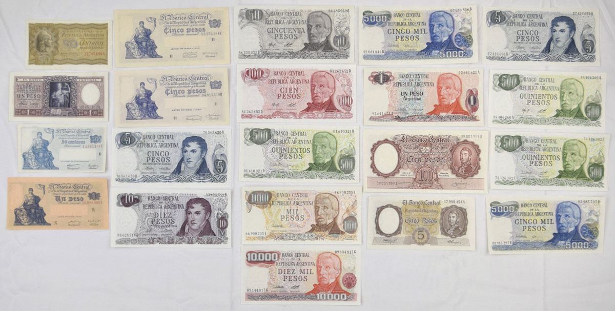 Argentina, L.1947 (1948-50)-ND (1983-84). Lot of 21 Issued Banknotes, Includes: L.1947 (1948-50), 50 Centavos, P-256, CMN; L.1947 (1950), 50 Centavos, P-259a, Garrasi; ND (1952-55), 1 Peso, P-260b; ND (1951-52), 1 Peso, P-262, CMN; ND (1951-59), 5 Pesos, P-264d (2), CMN; ND (1957-67), 100 Pesos, P-272a; ND (1960-62), 5 Pesos, P-275b, CMN; ND (1971-73), 5 Pesos, P-288 (2), CMN; 10 Pesos, P-289, CMN; ND (1974-75), 500 Pesos, P-298a (2); ND (1976-78), 50 Pesos, P-301b; 100 Pesos, P-302b; ND (1977-82), 500 Pesos, P-303c; ND (1976-83), 1000 Pesos, P-304b; ND (1977-83), 5000 Pesos, P-305b (2); ND (1976-83), 10,000 Pesos, P-306a; ND (1983-84), 1 Peso Argentino, P-311a, CdM. Notes range from UNC to Gem UNC condition. (21). Sold "AS IS" no returns accepted.