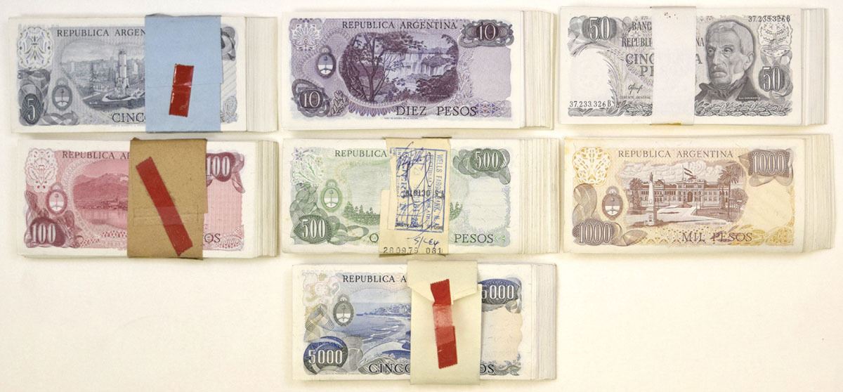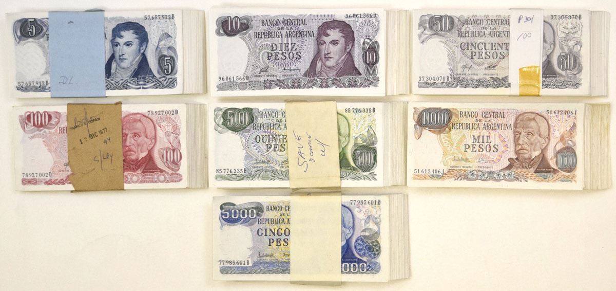 Argentina, ND (1974-83). Lot of 700 Issued Banknotes, Includes: ND (1974-76), 5 Pesos, P-294 (100); ND (1976), 10 Pesos, P-300 (100); ND (1976-78), 50 Pesos, P-301a (100); ND (1976-78), 100 Pesos, P-302b (100); ND (1977-82), 500 Pesos, P-303c (100); ND (1976-83), 1000 Pesos, P-304 (100); ND (1977-83), 5000 Pesos, P-305 (100). Notes are wrapped, some are original from printer and range from AU to UNC condition. (700). Sold "AS IS" no returns accepted.