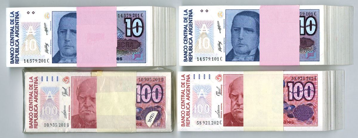 Argentina, ND (1985-90). Lot of 400 Issued Banknotes in Banks Original Packaging, Includes: 10 Australes, P-325b (200), Dark blue and purple on m/c with S. Derqui at center, S/Ns 14.579.101C to 14.579.300C; ND (1985-90), 100 Australes, P-327c (199), Dark red and purple on m/c underprint with D. F. Sarmiento at center, S/Ns 58.921.202C to 58.921.300C and 10.935.201D to 10.935.300D, all are in Choice AU to CU condition.