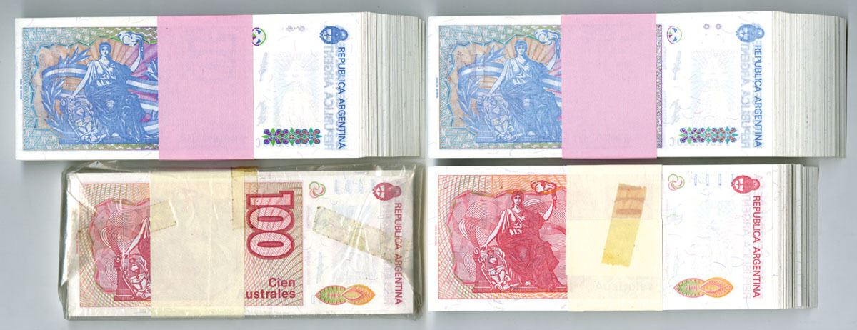 Argentina, ND (1985-90). Lot of 400 Issued Banknotes in Banks Original Packaging, Includes: 10 Australes, P-325b (200), Dark blue and purple on m/c with S. Derqui at center, S/Ns 14.579.101C to 14.579.300C; ND (1985-90), 100 Australes, P-327c (199), Dark red and purple on m/c underprint with D. F. Sarmiento at center, S/Ns 58.921.202C to 58.921.300C and 10.935.201D to 10.935.300D, all are in Choice AU to CU condition.