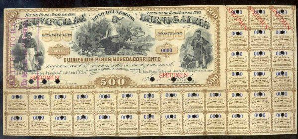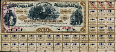 Argentina. 1880. P-S464A. 500 Pesos Specimen banknote with interst coupons attached. Allegorical woman in middle with army soldier and sailor with cannons on either side. Back has founders of bank. AU to Unc. Condition. Extremely rare note that is unpriced in pick. ABNC.