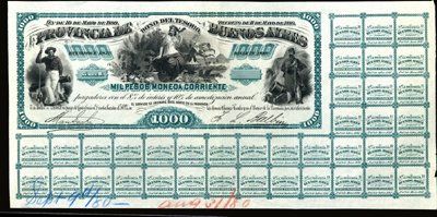 Argentina. 1880. P-S464B Unlisted. 1,000 Pesos Proof face and back banknotes with interest coupons attached, printed on india paper. Allegorical woman in middle flanked by army soldier and navy sailor with cannons on either side. Back has founders of bank. XF-AU Condition with archival folds from storage. Dated in crayon on bottom, Aug 26th to Sept 9th, 1880. Extremely rare note that is unpriced in pick and unlisted as proof. ABNC.