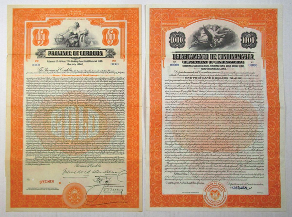 Argentina and Colombia. Lot of 2 Specimen Coupon Bonds, Includes: 1925, Province of Cordoba $1000 7% Sinking Fund Gold Bond of 1925, Black print on orange border and under tint, Allegorical woman at top, Specimen overprints and POC's; and, 1928, Department of Cundinamarca $1000 6 1/2% External Secured Sinking Fund Gold Bond, Black on orange border and underprint, Flying allegorical figure with winged wheel below her, Specimen overprints and POCs. Both bonds are in Fine to VF+ condition, the Argentina bond has been archivally reinforced, Printed by ABNC. (2). Sold "AS IS" no returns accepted.