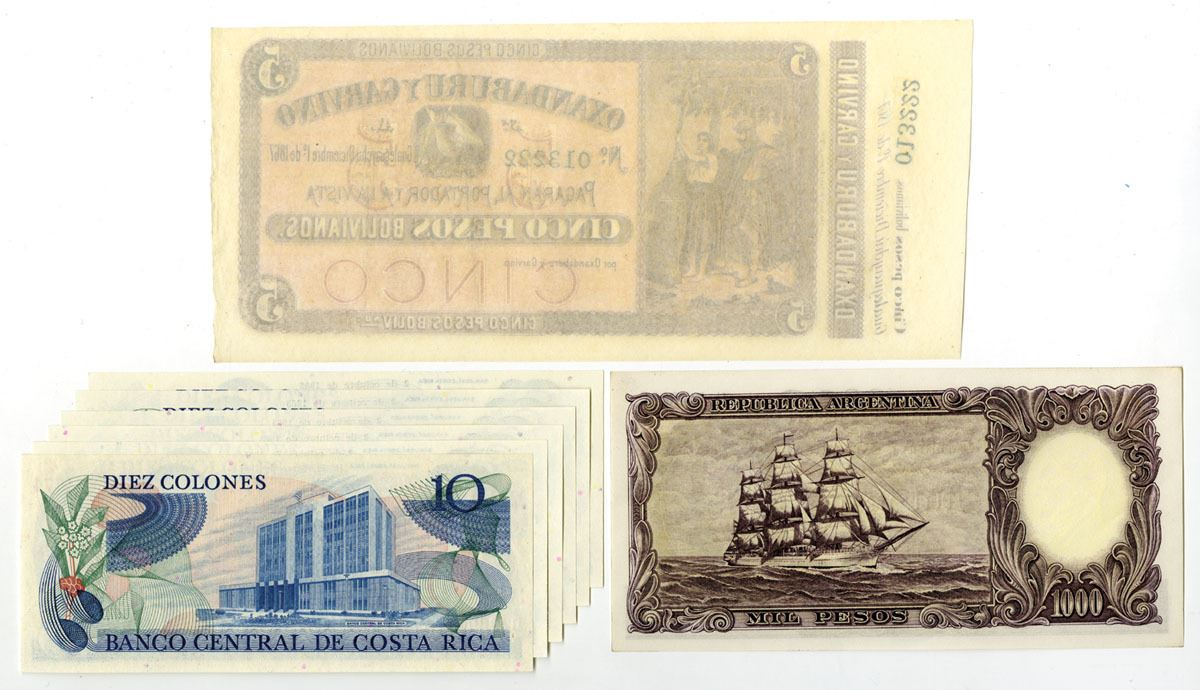 Argentina & Costa Rica, 1867-85. Lot of 8 Issued Banknotes, Includes: Banco Oxandaburu y Garvino, 1867, 5 Pesos Bolivianos, P-S1776a, Brown on red-violet and rose underprint; Banco Central de la República Argentina, ND (1966-69), 1000 Pesos, P-279b, Brown print; 1981-85, Banco Central de Costa Rica, 10 Colones, P-237b (6), Dark blue on m/c underprint, ABNC. Notes are in Choice AU-UNC to Gem Uncirculated condition. (8). Sold "AS IS" no returns accepted.