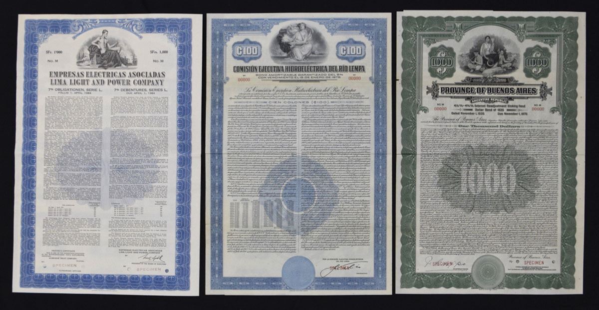 Argentina, El Salvador, and Peru , Lot of 3 Specimen Bonds, Includes: Argentina, 1935, Province of Buenos Aires, Argentina, $1000 4 1/2% - 4 3/4% External Readjustment Sinking Fund Coupon Bond with green border; El Salvador, 1950, Lempa River Hydroelectric Executive Commission, El Salvador, 100 Colones, 5% Guaranteed Coupon Bond with blue border; and, Peru. 1969, Lima Light and Power Co., Peru, 7% Series L Debenture Coupon Bond with blue border. All have Specimen overprints, POCs, and are in VF to XF condition. (3). Sold "AS IS" no returns accepted.