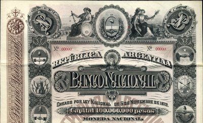 1889. 1000 Pesos/ 10 Shares. Specimen bond/stock certificate. Black border with brown undertint. Extremely ornate and multi-vignetted bond. Allegorical women flank Arms of Argentina state. Border has 14 different Arms from different states or provinces in Argentina. Coupons attached. Rare and attractive bond that exhibits the engravers artistic design abilities to the fullest. VF condition. ABNC.