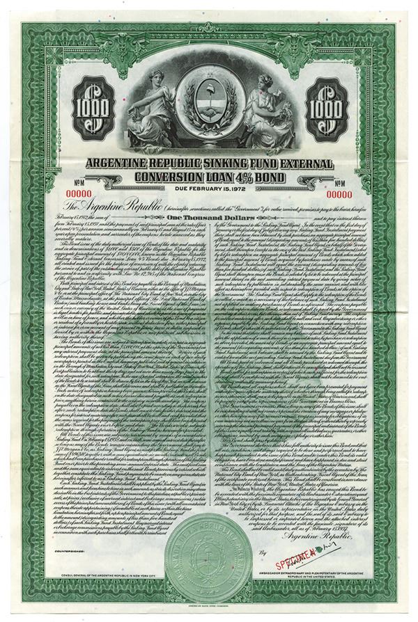 Argentina. $1,000 Sinking Fund External Conversion Coupon Loan 4% Specimen bond, Allegorical women flank Argentina arms, POC's, XF, Green, ABNC.