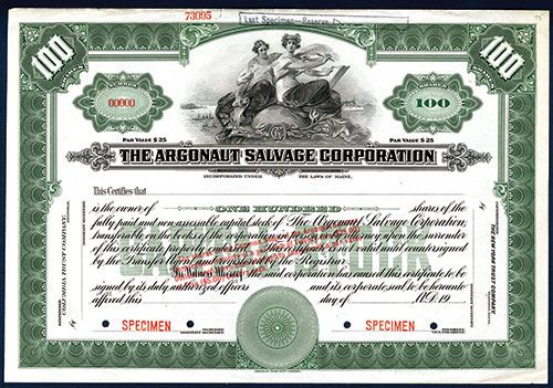 Maine, 19xx (ca.1910-30), 100 Shares, Black print on green border and underprint, POC's, VF condition, ABNC. One of the founders was Simon Lake an inventor of early models of the submarine.