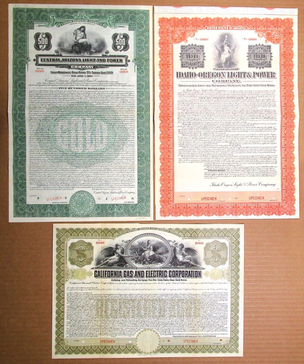 Arizona, California, Idaho & Oregon, 1907 to 1930. Lot of 3 Specimen Bonds, Includes: California Gas and Electric Corp. Registered Bond, 1907; Idaho-Oregon Light & Power Co., $100 6% Coupon Bond, 1910; Central Arizona Light and Power Co. $500 5% Bond, 1930. All have Specimen overprints, POCs, and are in VF to XF condition. (3). Sold "AS IS" no returns accepted.
