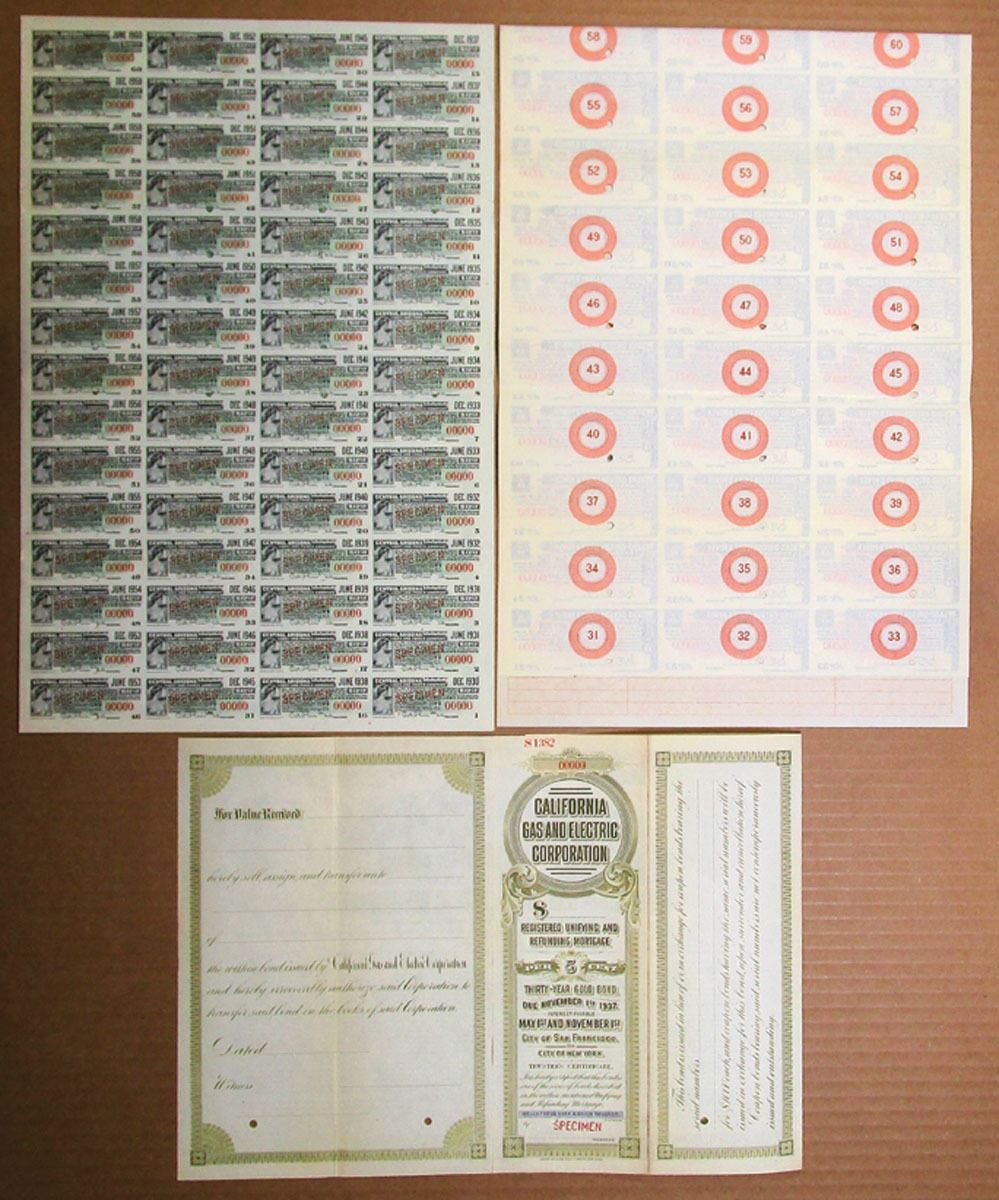 Arizona, California, Idaho & Oregon, 1907 to 1930. Lot of 3 Specimen Bonds, Includes: California Gas and Electric Corp. Registered Bond, 1907; Idaho-Oregon Light & Power Co., $100 6% Coupon Bond, 1910; Central Arizona Light and Power Co. $500 5% Bond, 1930. All have Specimen overprints, POCs, and are in VF to XF condition. (3). Sold "AS IS" no returns accepted.