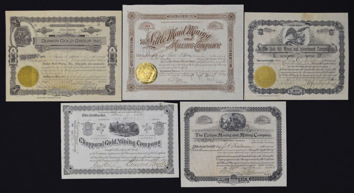 Various States....., 1882 to 1933. Lot of 5 I/U Mining Stock Certificates representing gold mining and investment operations, each with ornate borders, allegorical vignettes, and embossed corporate seals. Includes examples from CO. 1933, Dunkin Gold Group, Inc.; Co., 1893, The Little Maid Mining and Milling Co.; Idaho Springs, CO., 1908, The Gold Hill Mines and Investment Co.; Kelsey Mining District, County of Eldorado, CA. 1882, Chapparail Gold Mining Co.; and, CO., 1893, The Eclipse Mining and Milling Co. Conditions range from VF to XF overall, with minor handling. (5). Sold “AS IS” no returns accepted.