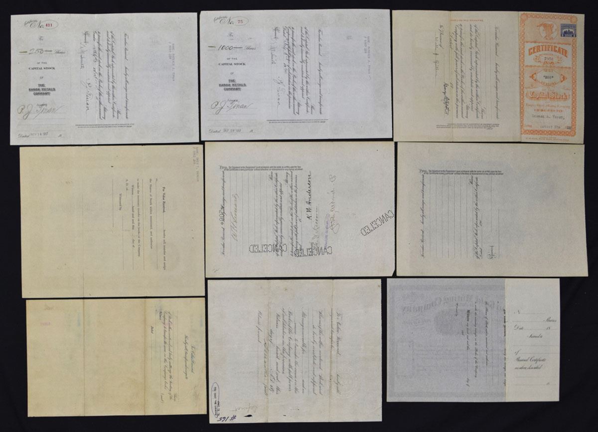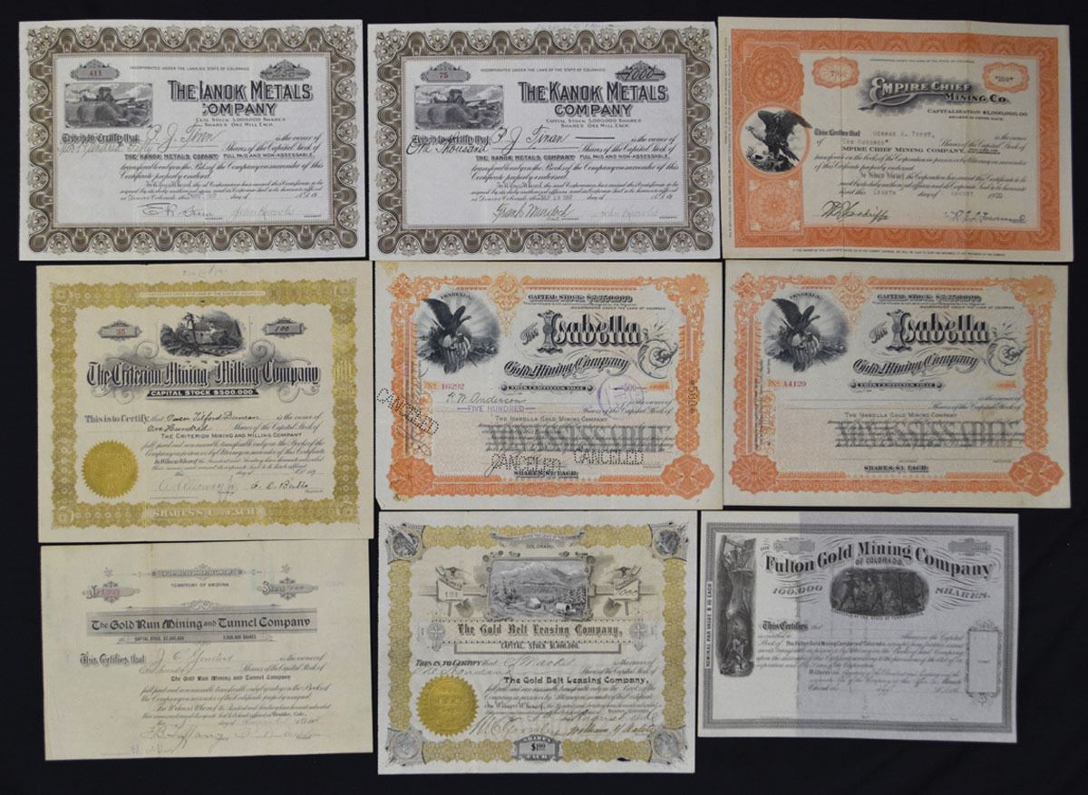 Arizona & Colorado, ND (1860s)-1929. Lot of 9 I/U and U/U Mining Stock Certificates representing gold, silver, and metal mining and leasing operations, each with ornate borders, mining vignettes, and embossed corporate seals. Includes examples from CO., 1917, I/U, The Kanok Metals Co. (2); CO., 1929, Empire Chief Mining Co.; CO., Partially issued, ca. 1890s, Criterion Mining & Milling Co.; CO., 1898, and U/U Isabella Gold Mining Co. (2); Co., 1908, Gold Run Mining and Tunnel Co. I/U; CO., 1896?, Gold Belt Leasing Co., I/U; and, ca.1860s, U/U, Fulton Gold Mining Co. of Colorado. Conditions range from VF to XF overall, with minor handling. (9). Sold “AS IS” no returns accepted.