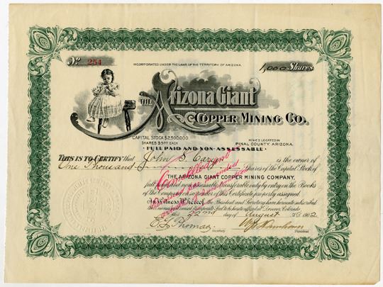 Mines Located in Pinal County, Arizona Territory, (Inc. in Colorado), 1902. 1000 Shares I/C Capital Stock Certificate, S/N 254, Black text with green border, Allegorical child at top left, Embossed company seal at bottom left. Cancelled in ink at center, Fine-VF condition.
