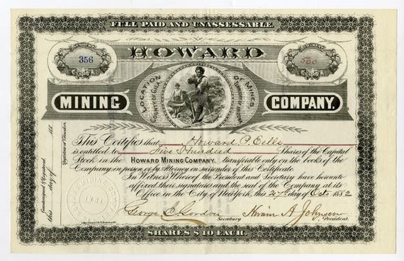 County of Gila, Arizona Territory (Offices in New York City), 1882. 500 Shares I/U Capital Stock Certificate, Black printing with black border, Miners at center, Company incorporated in New York but mines are located in Gila County Arizona, S/N 356, XF condition. Collins & Sesnon Lith.