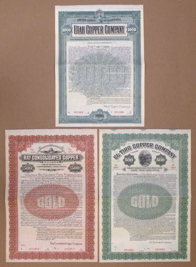 Arizona, Utah and other locations, 1904-09. Lot of 3 Specimen Mining Gold Bonds, Includes: Utah Copper Co., $1000, 7% Coupon Bond, 1904; Ray Consolidated Copper Co., $500, 6% Coupon Bond, 1907; and, El Tiro Copper Co., $500, 6% Coupon Bond, 1909. All have Specimen overprints and POCs, and are in VF to XF condition. FLBNC/ABNC. (3). Sold "AS IS" no returns accepted.