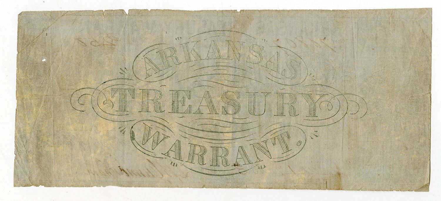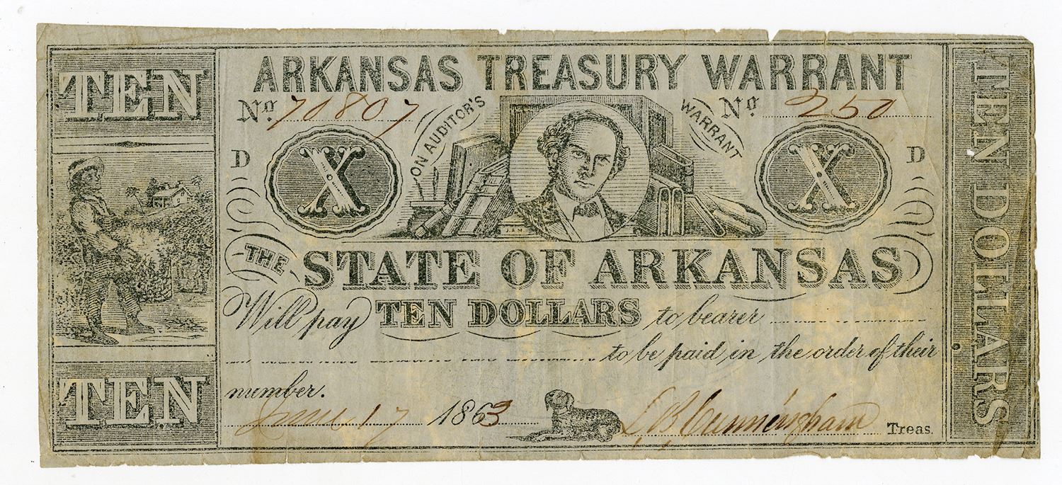 Little Rock, Arkansas. June 17, 1863, Arkansas Treasury Warrant. $10, (Cr.56 Rothert 393-3), Issued obsolete scrip note, Act of November 14th & 18th, 1861, Black text, Bust of Samuel Adams at top center flanked by "On Auditor's Warrant, Printed on blue paper, "Interest at Eight Per Centum Per Annum" removed, Signature at bottom right, S/N 70807 / 250, VF condition with light toning, Printer missing from left. Rarity 9 in Criswell, Rarity 9 in Shull, Rarity 2 in Rothert.