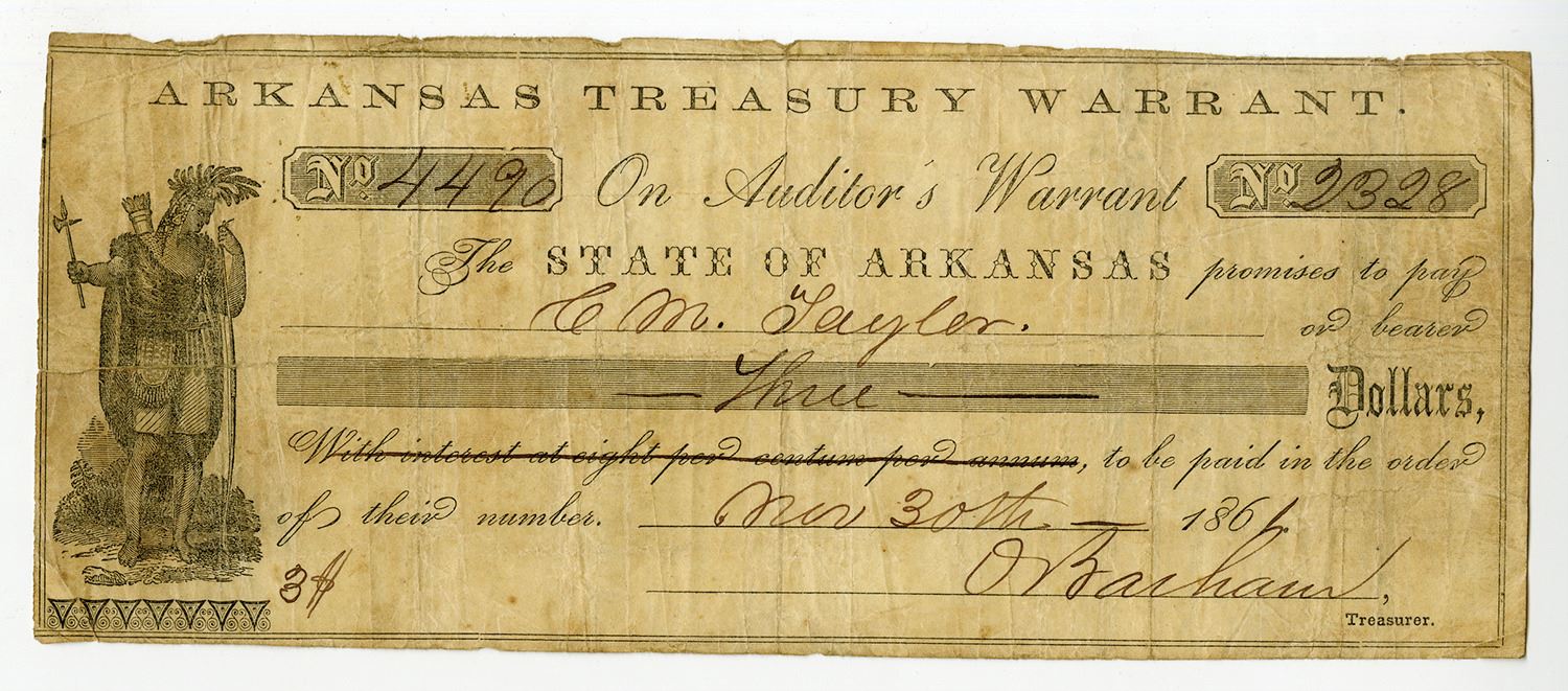 Little Rock, Arkansas. November 30, 1861, Arkansas Treasury Warrant. $3 (Hand written), (Cr.17A Rothert 382-1), Issued obsolete scrip note, Act of November 14th & 18th, 1861, Black text with black border, "On Auditor's Warrant" at top center, Native American man at left, Signature at bottom right corner, S/N 4490 / 2328, VG to Fine condition with toning. Rarity 10 in Shull, Rarity 6 in Rothert.