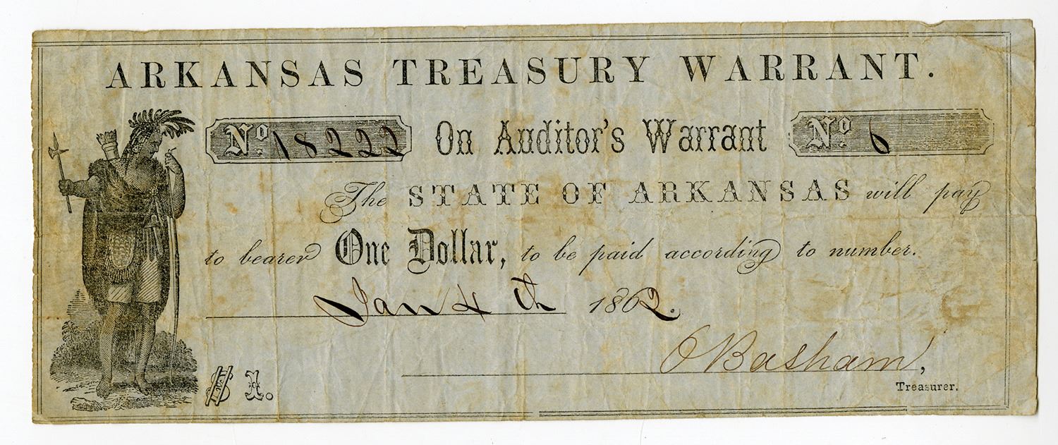 Little Rock, Arkansas. January 4, 1862, Arkansas Treasury Warrant. $1, (Cr.12 Rothert 381-1), Issued obsolete scrip note, Act of November 14th & 18th, 1861, Black text with black border, "On Auditor's Warrant" at top center, Native American man at left, Hollow $1 figure at bottom left, Signature at bottom right corner, S/N 18222 / 6, Choice Fine condition with toning. Rarity 11 in Criswell, Rarity 9 in Shull, Rarity 6 in Rothert.