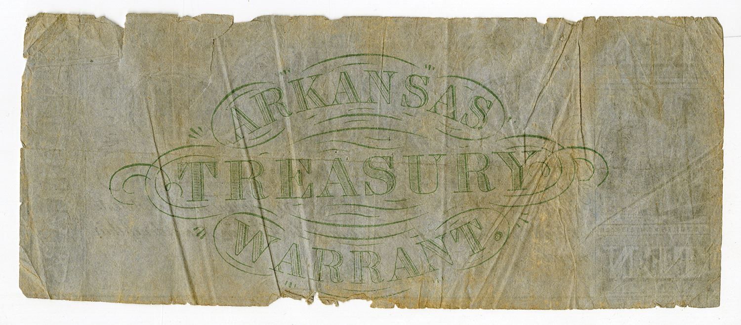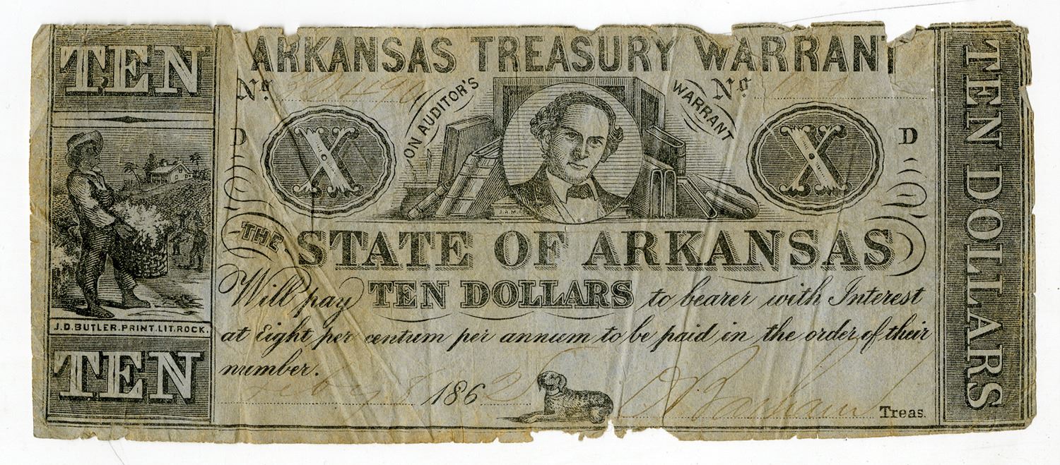 Little Rock, Arkansas. February 8, 1862, Arkansas Treasury Warrant. $10, (Cr. 56 Rothert 393-1), Issued obsolete scrip note, Act of November 14th & 18th, 1861, Black text, Bust of Samuel Adams at top center flanked by "On Auditor's Warrant, Printed on blue paper, Signature at bottom right, Faded S/N, Choice VG to Fine condition with toning and rough top and bottom margins, J.D. Butler. Rarity 2 in Rothert.