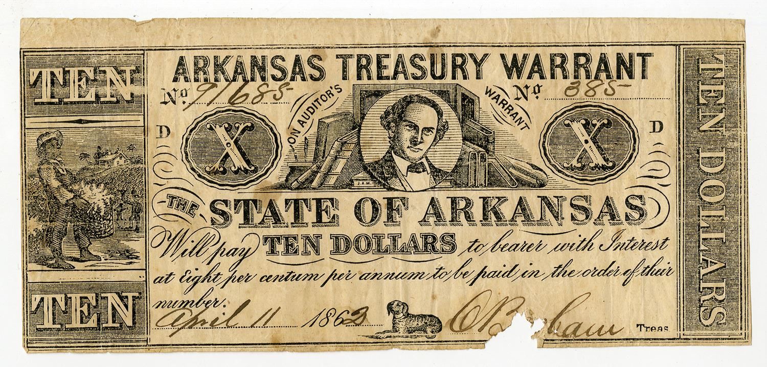 Little Rock, Arkansas. April 11, 1862, Arkansas Treasury Warrant. $10, (Cr.54 Rothert 393-1), Issued obsolete scrip note, November 14th & 18th, 1861, Black text, Bust of Samuel Adams depicted at top center flanked by "On Auditor's Warrant," Printed on white paper, Blank back, Signature at bottom right corner, S/N 91685 / 385, Choice Fine condition with toning and a small piece missing from bottom center signature, Without Printer listed at left. Rarity 6 in Criswell, Rarity 5 in Shull, Rarity 2 in Rothert.