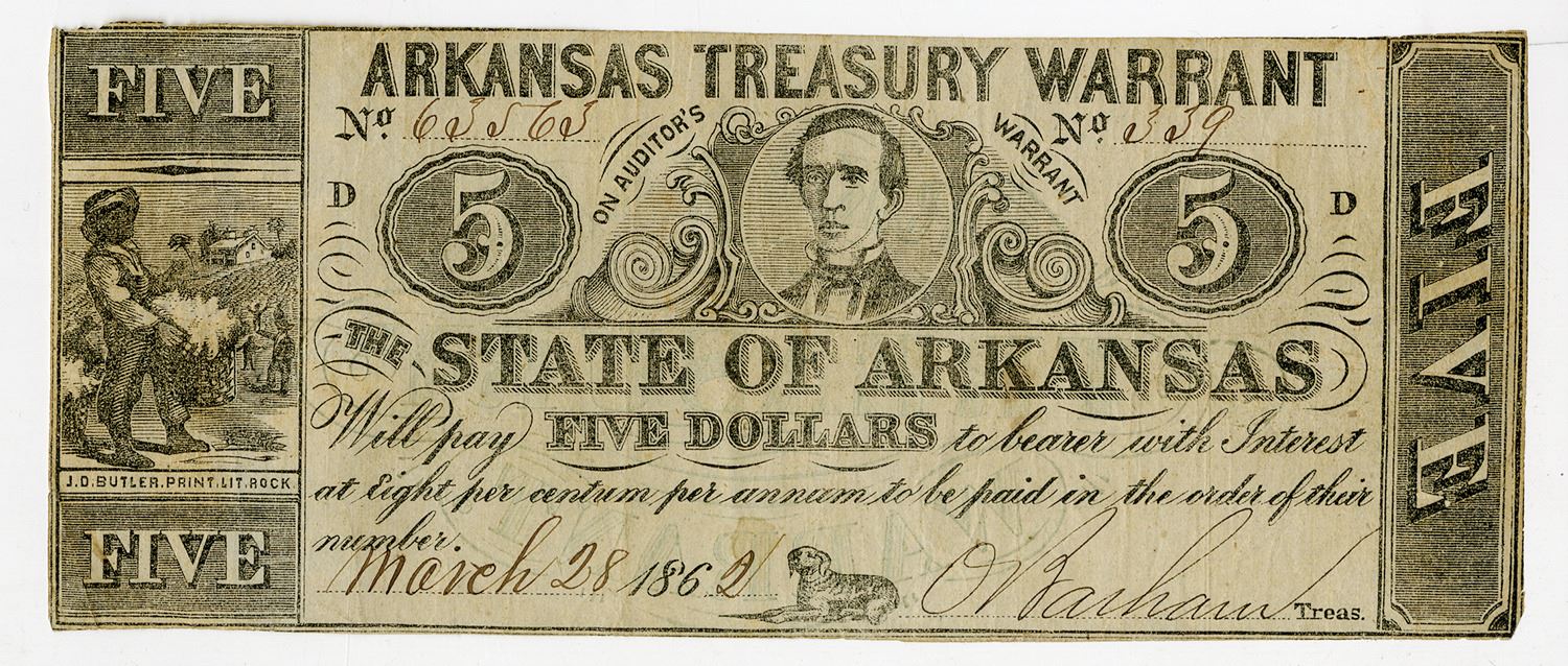 Little Rock, Arkansas. March 28, 1862, Arkansas Treasury Warrant. $5, (Cr.50 Rothert 392-1), Issued obsolete scrip note, Act of November 14th & 18th, 1861, Black text, Bust of Governor H.M. Rector at center flanked by "On Auditor's Warrant," Printed on white paper, Green on back, Signature at bottom right, S/N 63563 / 339, VF to Choice VF condition with light toning, J.D. Butler. Rarity 6 in Criswell, Rarity 4 in Shull, Rarity 2 in Rothert.
