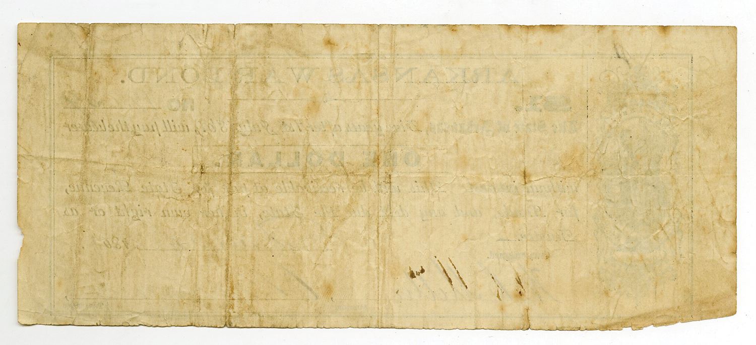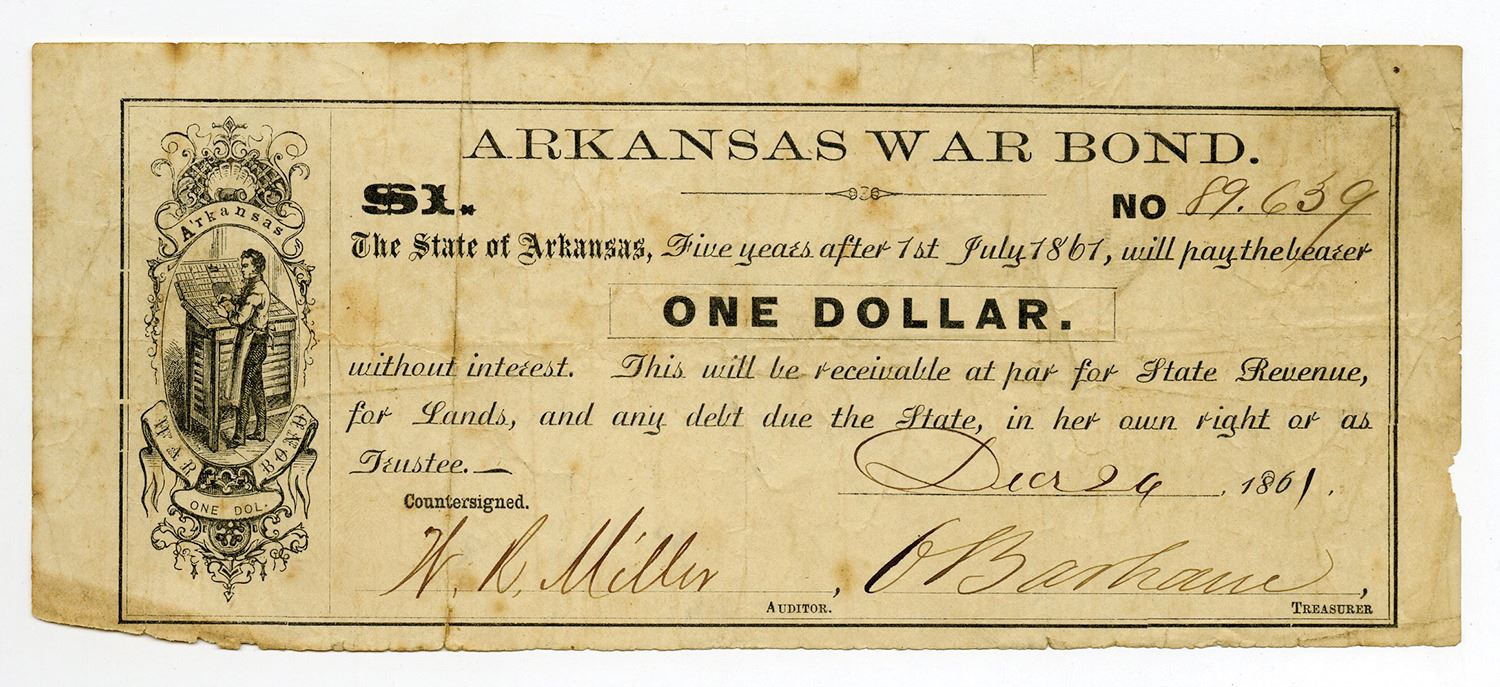 Arkansas. December 29, 1861, War Bond. $1, (Cr.27), Issued obsolete scrip note, Act of May 28th, 1861, Black text with black border, Printer standing at left, S/N 89639 (possibly 89659), Choice Fine condition with foxing and a fold line at left, light toning of paper. Rarity 10 in Shull. Extremely rare note with no previous auction appearances at Heritage or