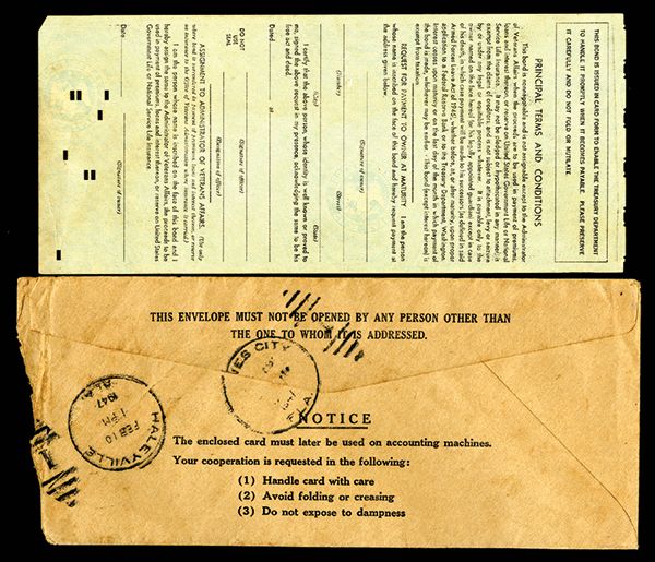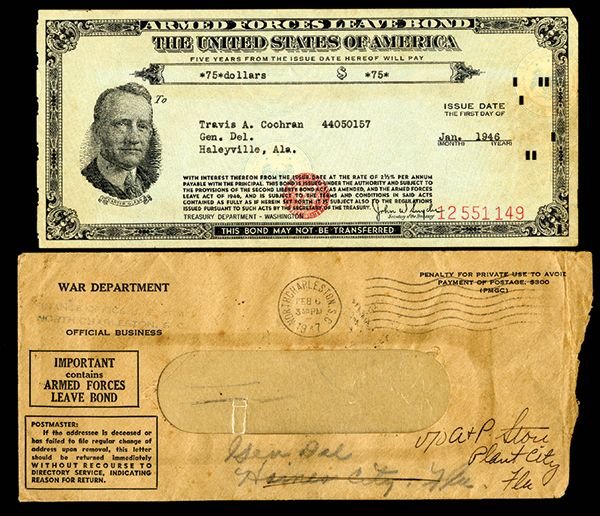 Armed Forces Leave Bond, 1946 Issued Rarity. United States of America, Armed Forces Leave Bond and Envelope. 1946, $75.00. Schwan/ Boling #321, Rare with Original Envelope, Armed Forces Leave Bonds were issued under the provision of the Leave Act of 1946. Carter Glass left, Black and Blue, Red Treasury Seal and Serial Number. Back has terms of Negotiation on ADP Punch Card. Bond printed on thin card in AU to Uncirculated condition, minor soiling from envelope. Envelope has pen and pencil markings.