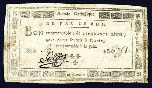 France, ND (Nov. 1793), 50 Livres, P-A98, Issued banknote, 138 x 75 mm's, S/N 6791, Choice VF to XF condition with light mounting remnants on back and two small 2mm tears on the right margin.