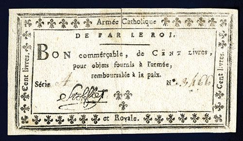 France, ND (Nov. 1793), 100 Livres, P-A99, Issued banknote, 132 x 72 mm's, S/N 3466, AU to Choice AU condition with light mounting remnants on back. Rare note in any condition and missing from most advanced collections.
