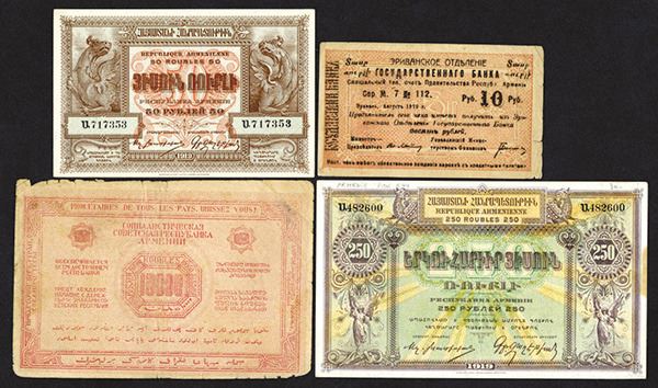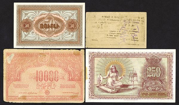 Armenia, lot of 4 notes, includes 10 Rubles, 1919 (1920), P-14, Fine; 50 Rubles, 1919 (1920), P-30, AU; 250 Rubles, 1919 (1920), P-32; and 10000 Rubles, 1921, P-S680.