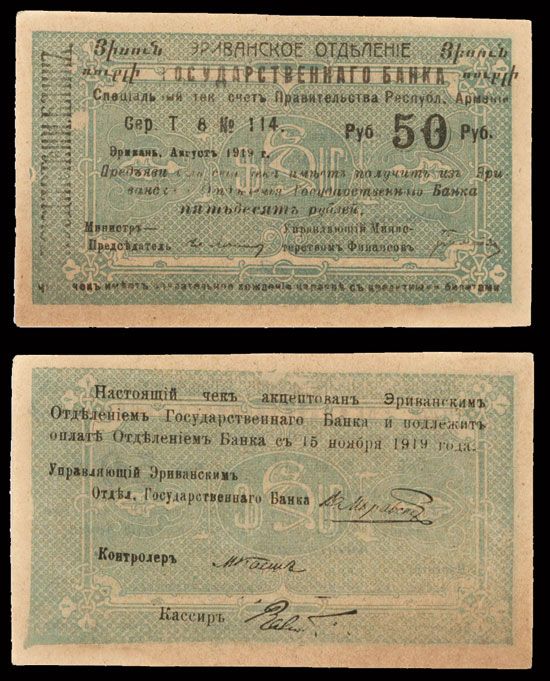 Armenia, 1919, 50 Rubles, P-9, Issued, Black on green underprint, back black on green, Armenian text on top left and right margins, S/N T 8 No. 114, Uncirculated to CU, crisp and firm paper, scarce in high grade.