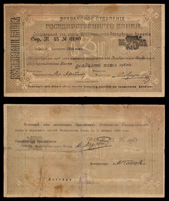 Armenia, 1919 (1920), 25 Rubles, P-20a, Issued, Black on light brown over tan underprint, back black printing over slightly lighter underprint design and color from front, No Armenian text on top left or right margins, S/N K 45 No. 0180, Choice Fine condition with a small hole in center due to a strong fold, paper firm except where folded.