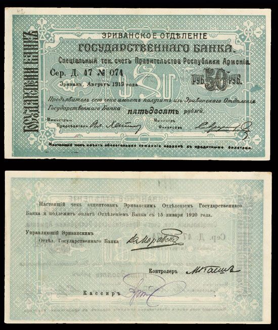 Armenia, 1919 (1920), 50 Rubles, P-21, Issued banknote, Black on green-blue underprint, back black over slightly lighter underprint design and color from front, No Armenian text on top left or right margins, S/N 47 No. 074, Choice XF to AU condition with bright colors, scarce in high grade.