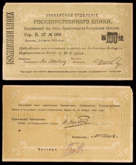 Armenia, 1919 (1920), 100 Rubles, P-22 Issued banknote, Black on light green underprint, back black over mustard-green underprint, No Armenian text on top left or right margins, S/N b 37 No. 086, XF to Choice XF condition with bright colors but a nibbled upper left corner as the only distraction on this lovely note.