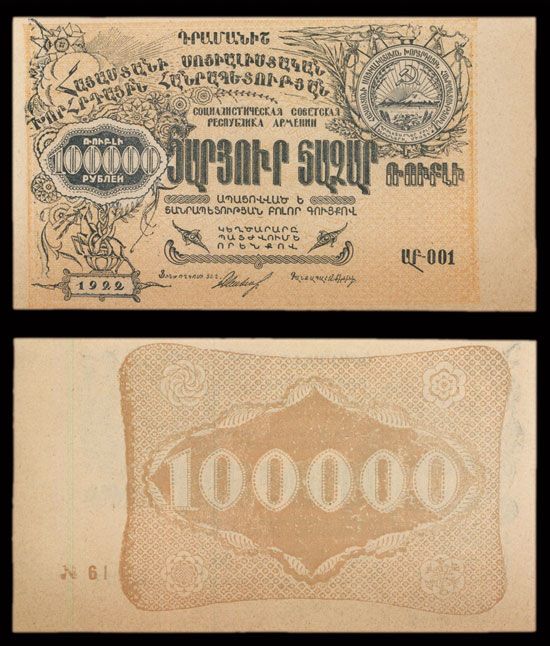 Armenia, 1922, 100,000 Rubles, P-S682, Issued banknote, Gray-green on yellow-brown underprint with arms at center, back light brown, Uncirculated to CU Condition, attractive example for issue.