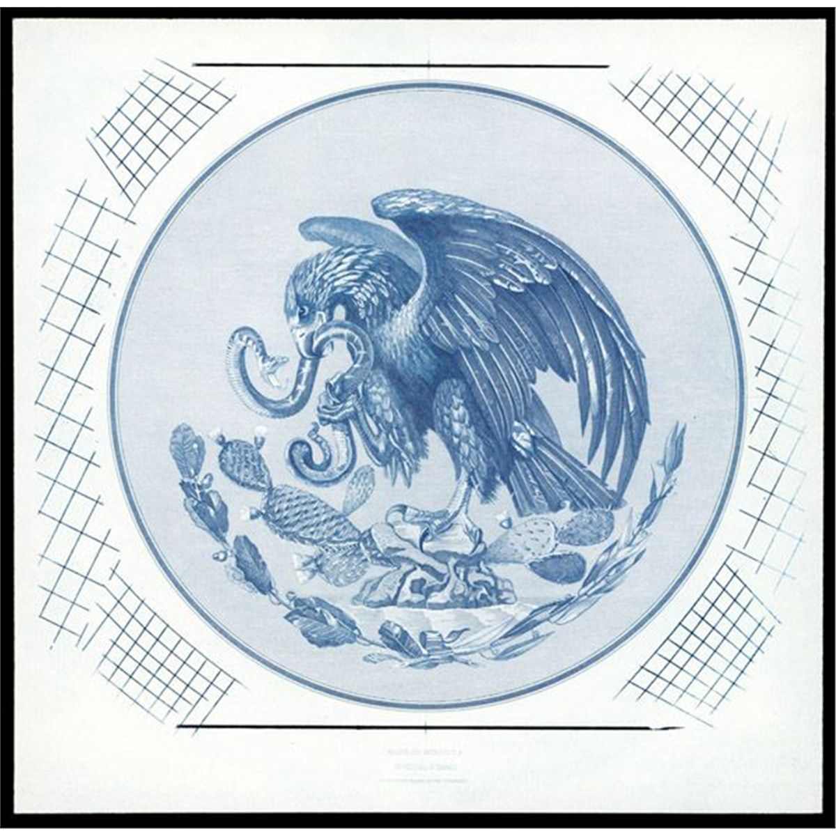 Mexico, ND (ca.1910-40), Large sized vignette, 8 by 8 inches, with dramatic eagle with snake in beak sitting on cactus in circle in blue with cross hatchings on outer areas, Banco De Mexico S.A., Special V-59421 American Bank Note Co. Imprint. Uncirculated, extremely attractive vignette. ABNC.