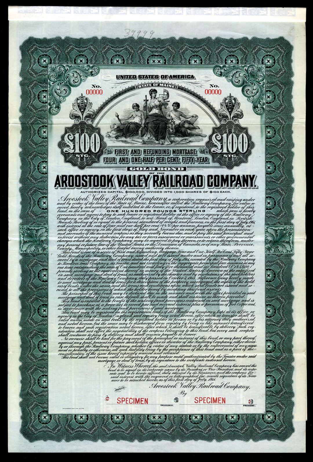 Maine, £100 Sterling, Specimen 4 1/2% 50 Year Gold Coupon Bond, Vertical format, Black on green border and underprint, Allegorical young women and man on top, VF-XF condition, IBNC. Unlisted Bond design and type in Cox. Unlisted as bond in Cox, only as a stock certificate. Rare bond and very attractive.