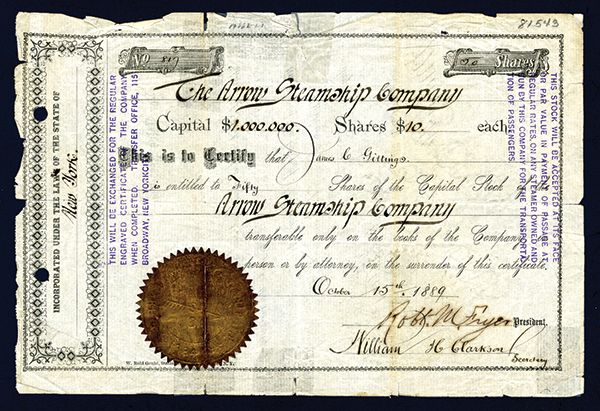 Arrow Steamship Co., 1889 Stock Certificate. New York, 1889, I/U, 50 Shares at $10 per share, Hand written title on generic stock certificate form, VG to Fine with edge faults , small tears and toning, gold seal, Text on left states that certificate will be exchanged for engraved certificate. This certificate was discovered in 1982 and is considered unique.
