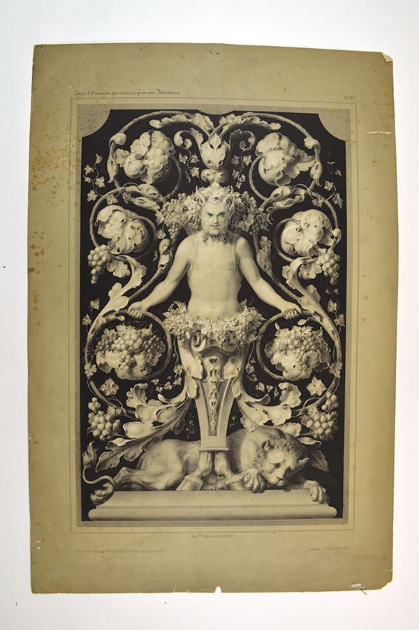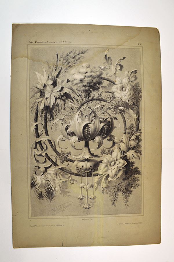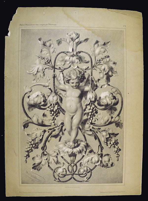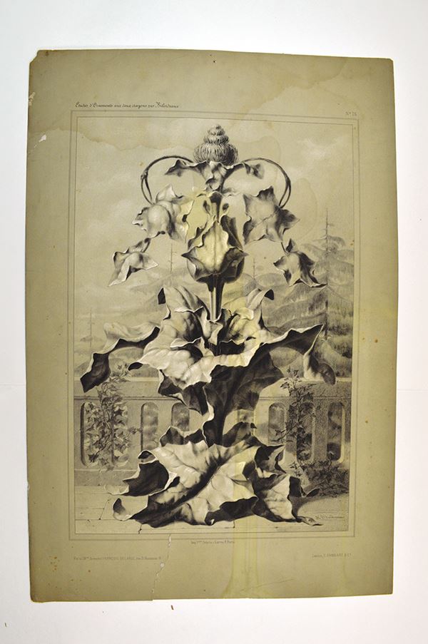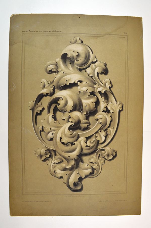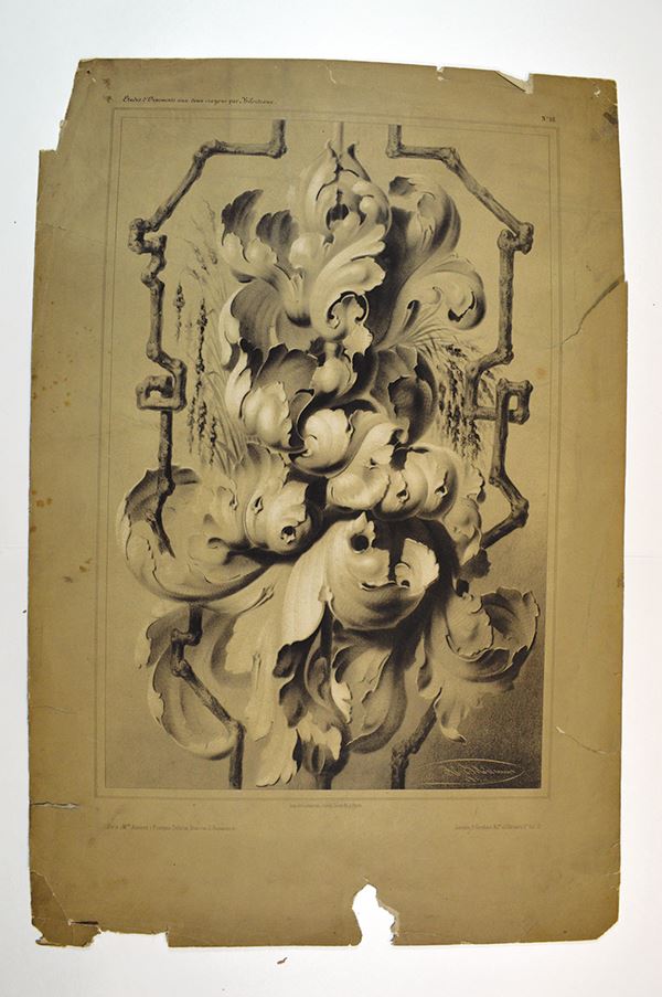 Etudes d'Ornements aux deuz crayons par Bilordeaux. Floral and decorative flourishes. Large format. Some torn, water damaged, edge chipping. 7 pieces.