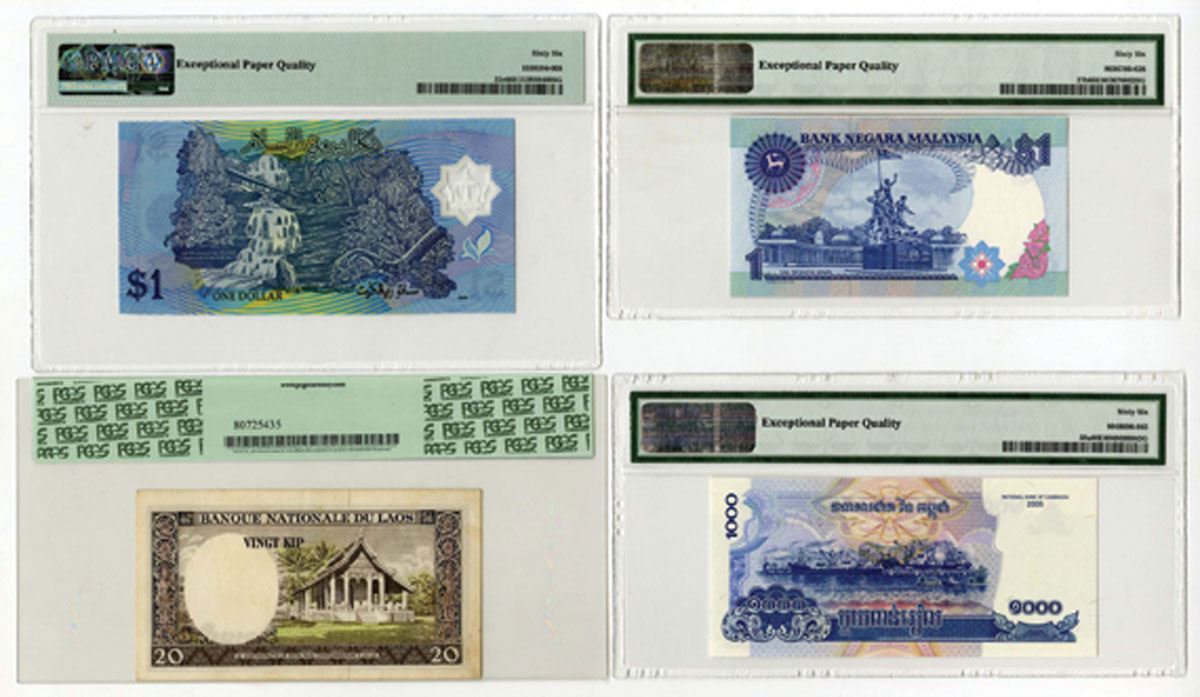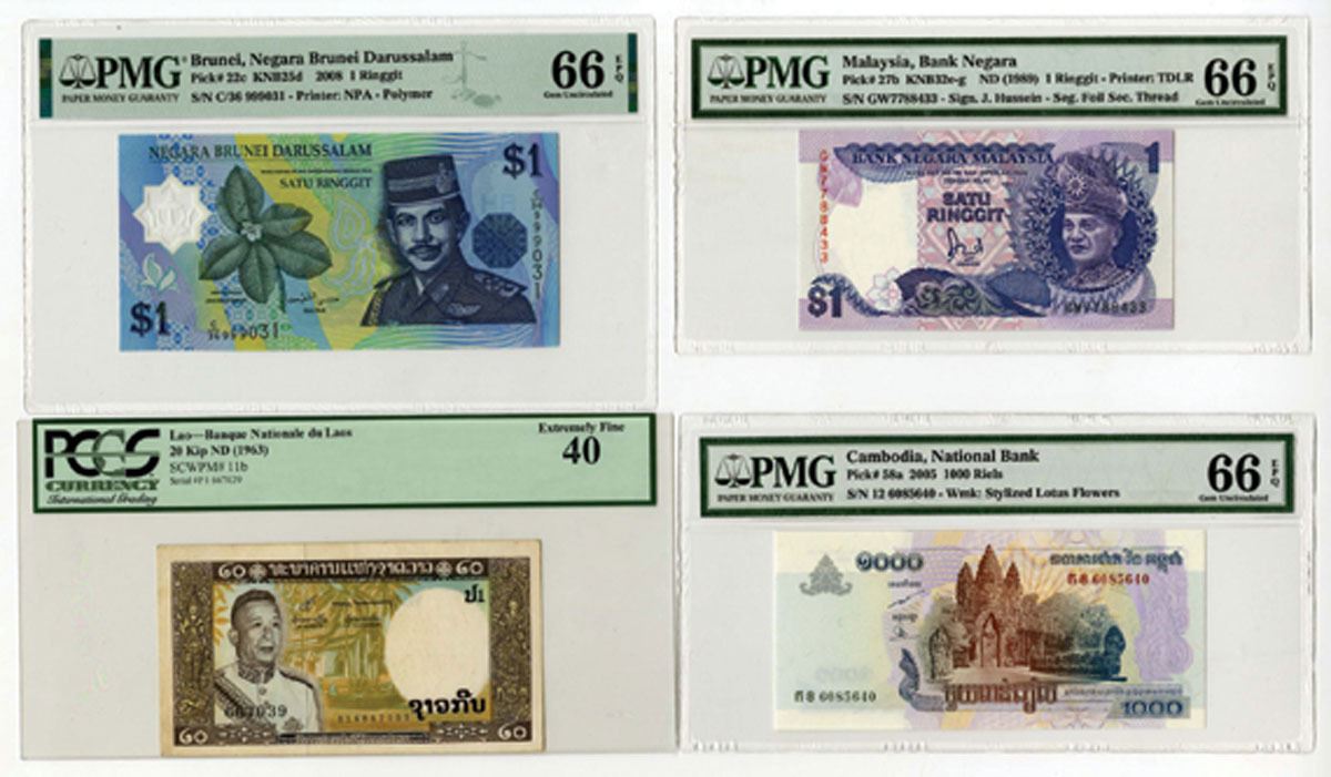 Brunei, Lao, Cambodia, and Malaysia, 1963 to 2008. Lot of 4 Issued Banknotes, Includes: Negara Brunei Darussalam 1 Ringgit, P-22c KNB25d, 2008, S/N C/36 999031, PMG Gem Unc 66 EPQ, NPA; Banque Nationale du Laos 20 Kip, P-11b, ND (1963), S/N P1 667039, PCGS graded Extremely Fine 40; 2005, National Bank of Cambodia 1000 Riels, P-58a, S/N 12 6085640, PMG Gem Unc 66 EPQ; Bank Negara Malaysia 1 Ringgit, P-27b KNB32e-g, ND (1989), S/N GW7788433, PMG Gem Unc 66 EPQ, TDLR. (4).