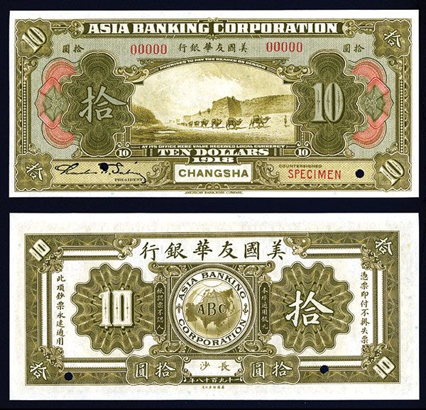 Changsha, China, 1918, $10, P-S113 Unlisted Branch Location, Specimen banknote, Olive-green on m/c on face with camel caravan along Great Wall, back olive-green with bank seal, Specimen overprints, POCs', S/N 00000, ABNC.