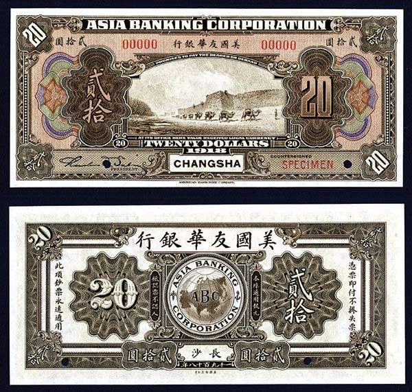 Changsha, China, 1918, $20, P-S114 Unlisted Branch Location, Specimen banknote, Brown on m/c on face with camel caravan along Great Wall, back brown with bank seal, Specimen overprints, POCs', S/N 00000, ABNC.
