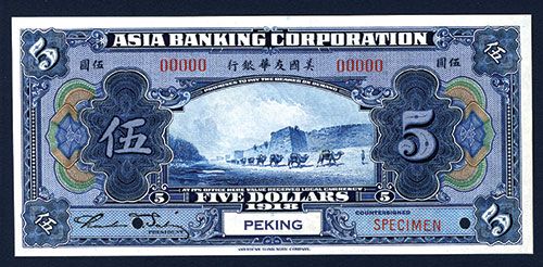 Peking, China, 1918, $5, P-S112s2 S/M#Y35-2c, Specimen banknote, Green on light brown on face with camel caravan along Great Wall, back green with bank seal, Specimen overprints, POCs', S/N 00000, ABNC.